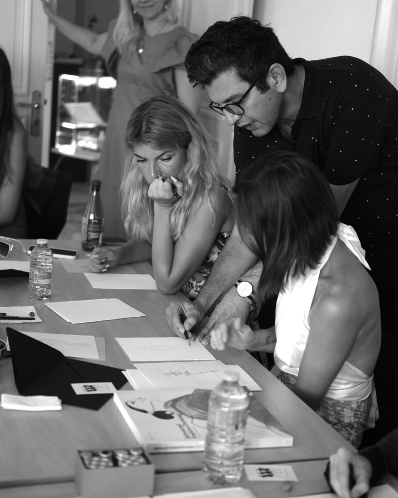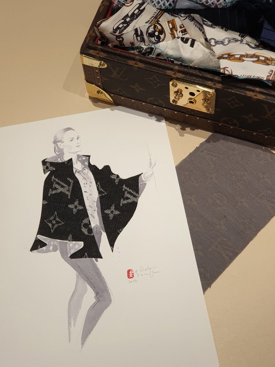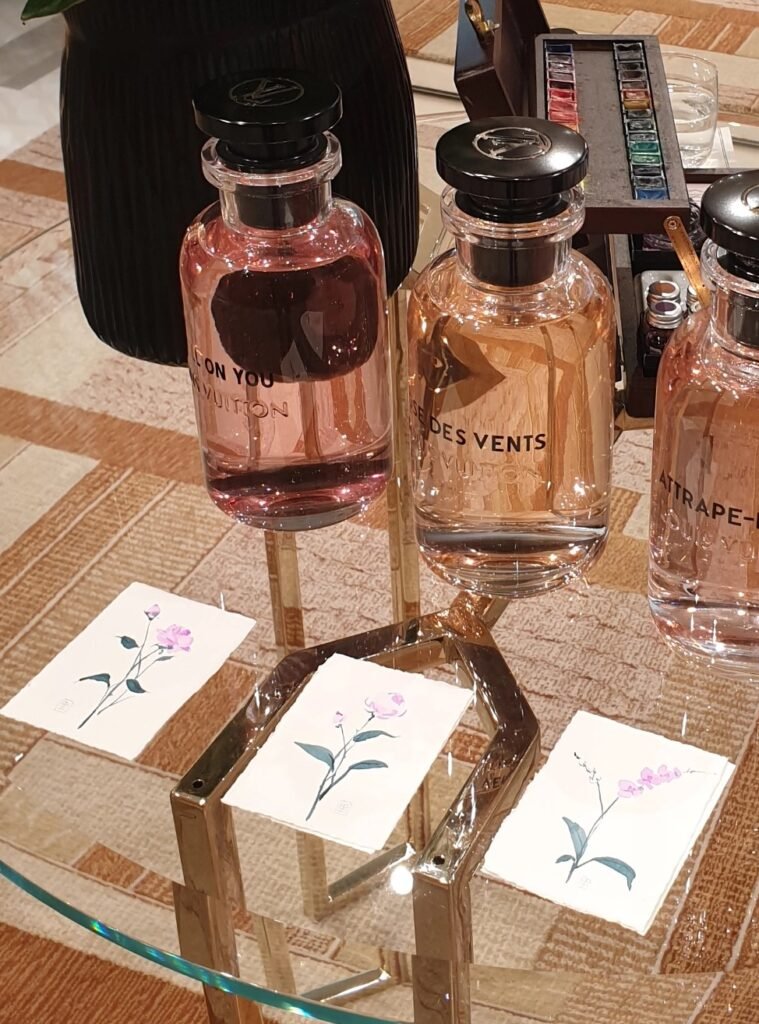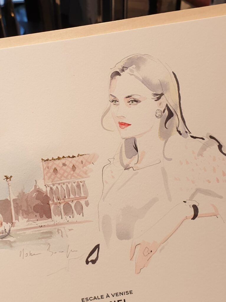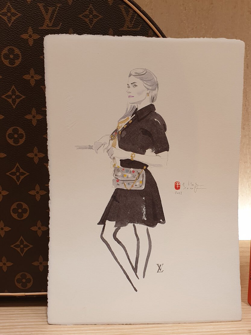 Chaque projet commence par une séance de brainstorming, où nous explorons ensemble les idées et les éléments à intégrer. Par exemple, j’ai eu l’occasion d’intégrer des échantillons de tissu Louis Vuitton dans mes dessins, de créer des illustrations directement sur des packagings, et même d’utiliser le raisin du rouge à lèvres Guerlain pour réaliser des œuvres singulières. Cette approche garantit que chaque création est non seulement esthétique, mais aussi en parfaite harmonie avec l’identité de la marque, tout en offrant une expérience mémorable aux invités.