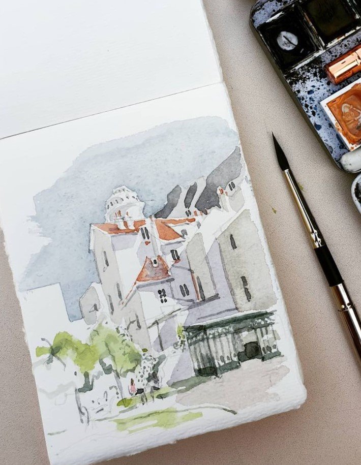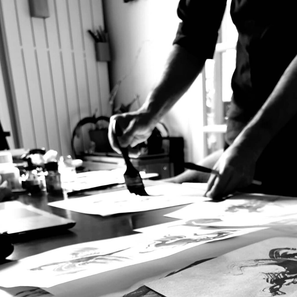 Après de nombreux essais et recherches, j’ai sélectionné un papier artisanal, 100 % coton, fabriqué à la main par l’atelier Amatruda, un moulin familial situé à Amalfi, en Italie. Ce papier offre une texture et un aspect remarquables, particulièrement adaptés à mon travail au lavis.