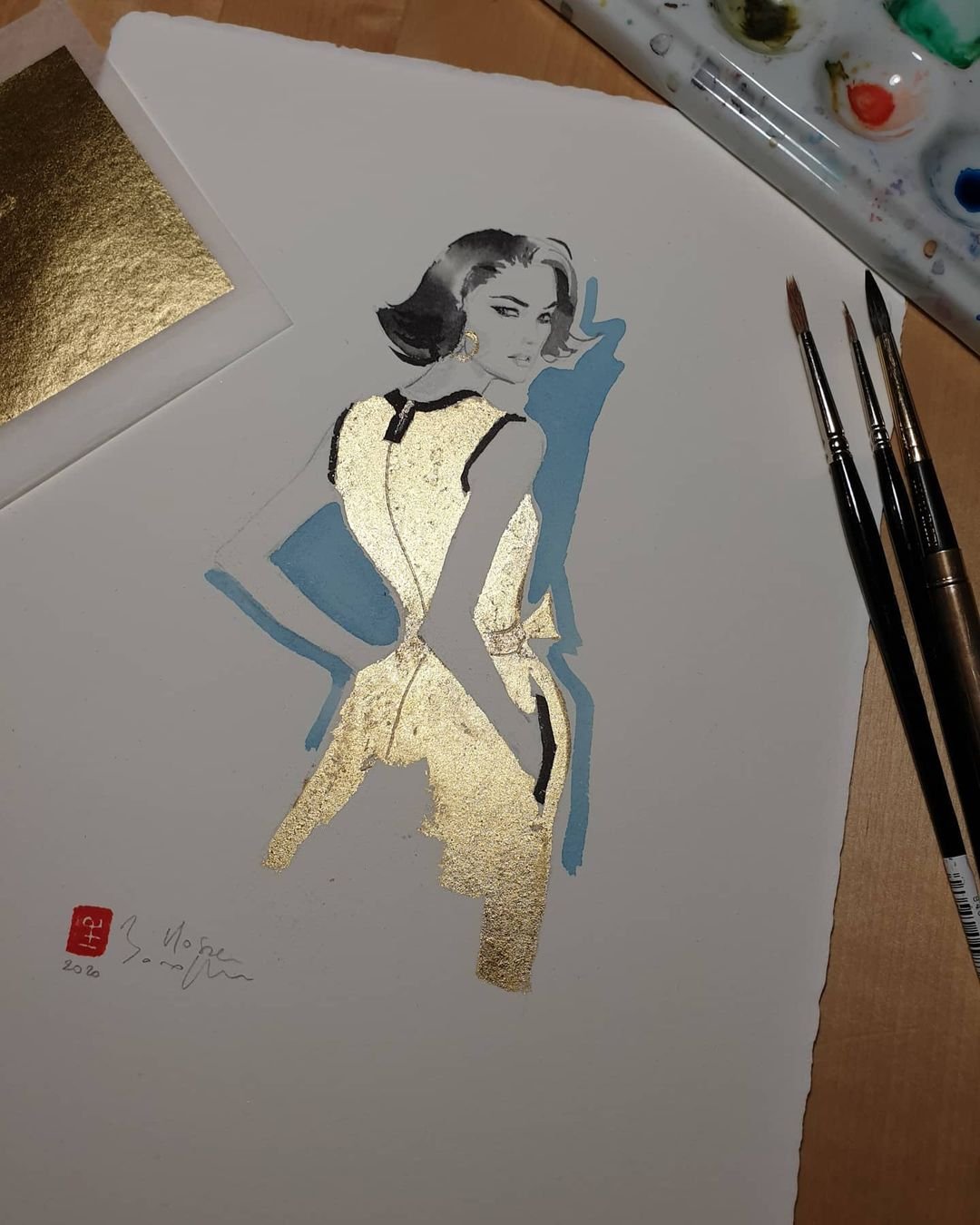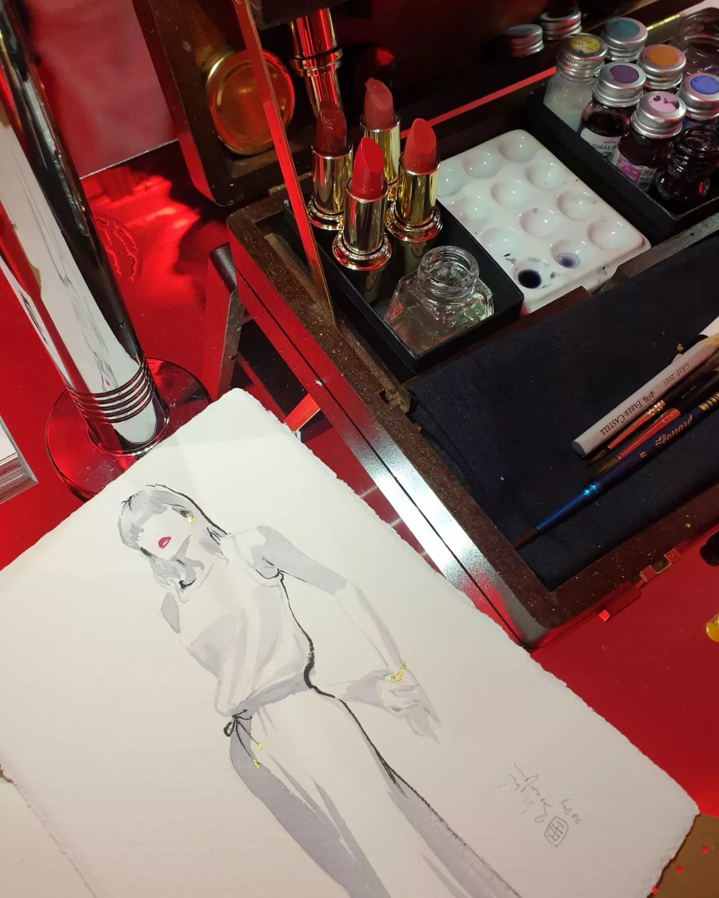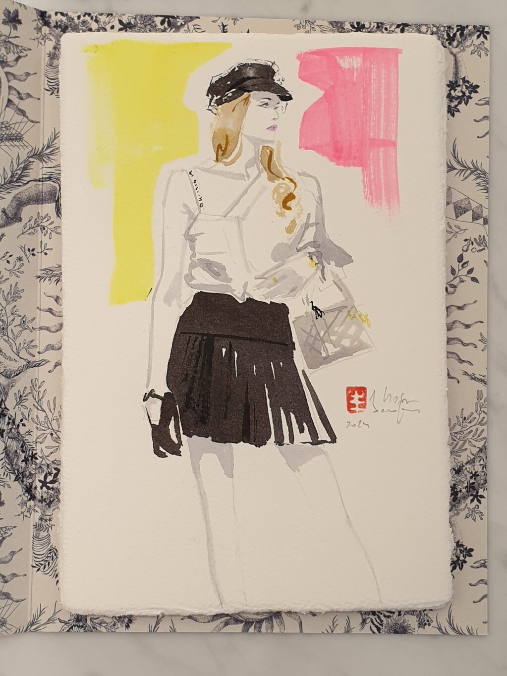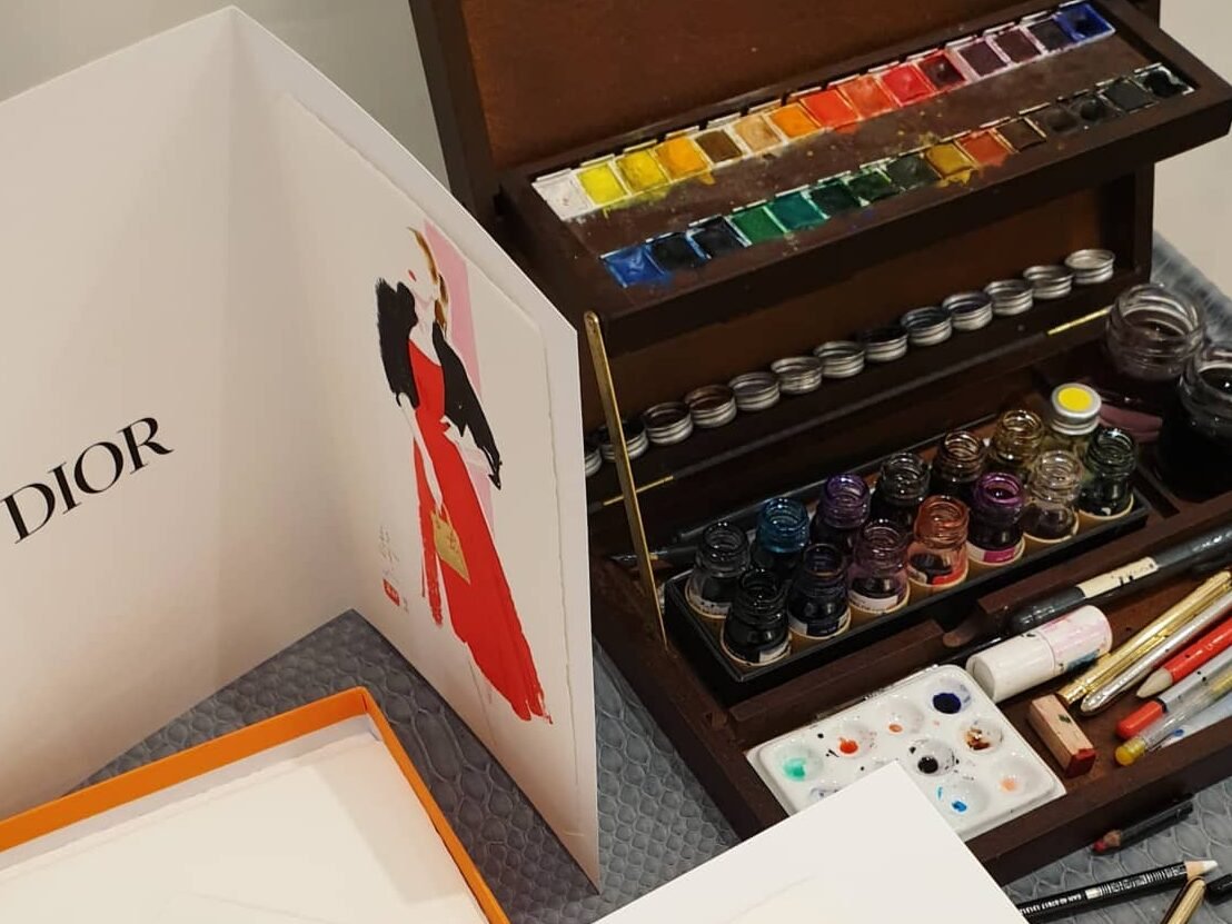 Je peins avec les encres Herbin, fabricant français depuis le XVIIIe siècle, dont les pigments d’origine naturelle garantissent des couleurs riches et éclatantes. Je fabrique également certaines teintes sur-mesure, au plus près des codes couleurs des maisons de luxe.