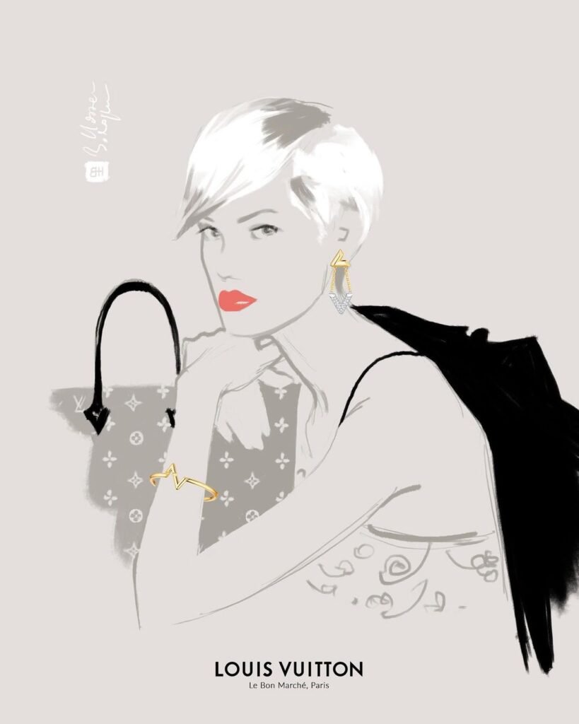 Ce qui rend cette expérience encore plus unique, c’est ma capacité à intégrer des éléments photographiques en direct : après avoir réalisé le portrait de l’invitée, elle peut choisir un bijou que j’ai déjà pré-détouré sur un calque. Je l’inclus alors directement dans le dessin, créant ainsi une œuvre qui met en valeur à la fois son image et le bijou de la marque.