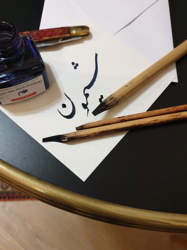Chaque invité me confie un mot, souvent son prénom, que je retranscris d’abord en langue persane avant de le calligraphier sur papier d’art.